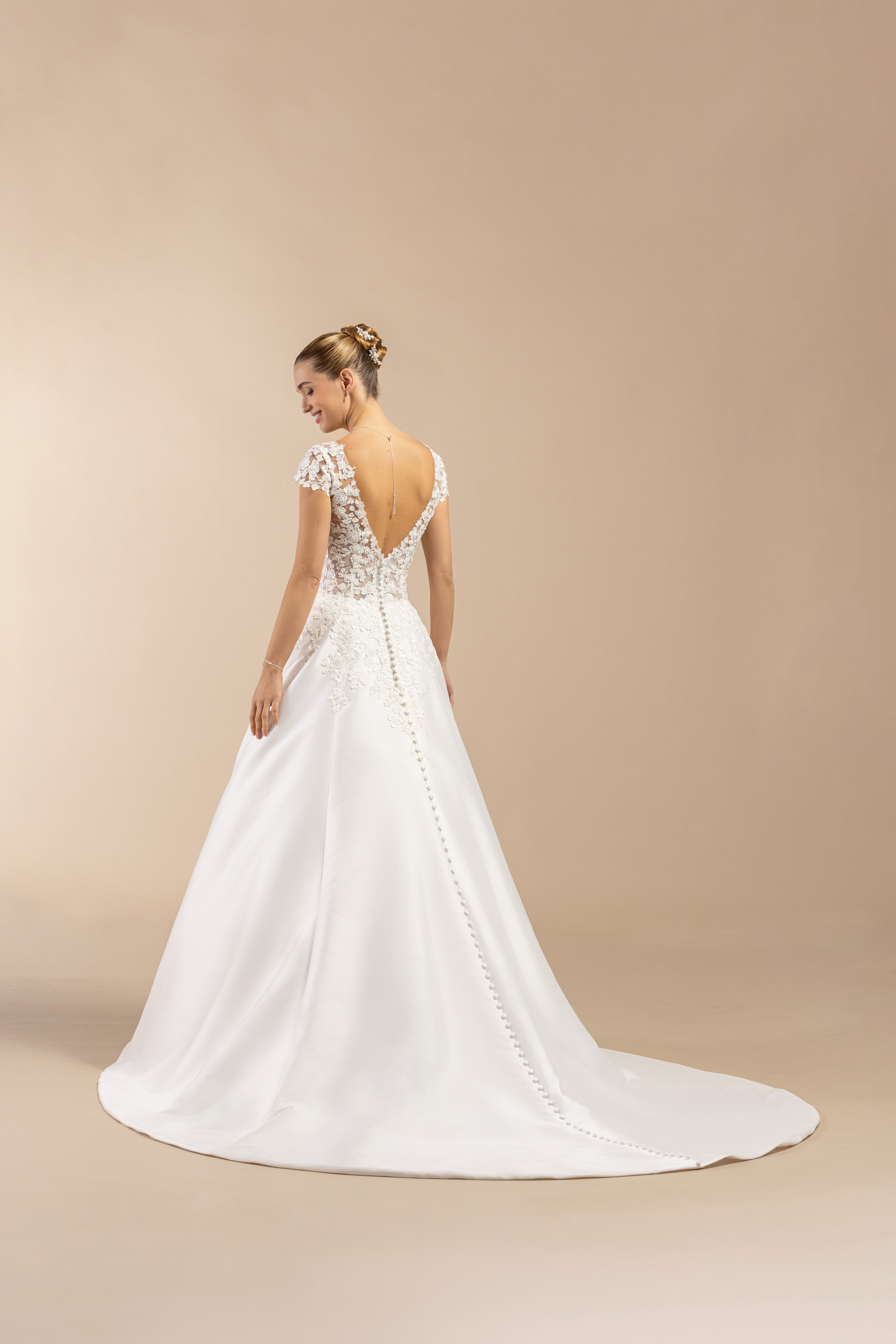 Am Rücken zeigt sich das Kleid von seiner besonders edlen Seite: Die transparente Spitze gibt den Blick sanft frei und wird von einer feinen Knopfleiste ergänzt, die sich stilvoll bis in den Rock fortsetzt. Ein Detail, das zeitlose Eleganz mit einem Hauch Glamour verbindet – ganz ohne Überladung.