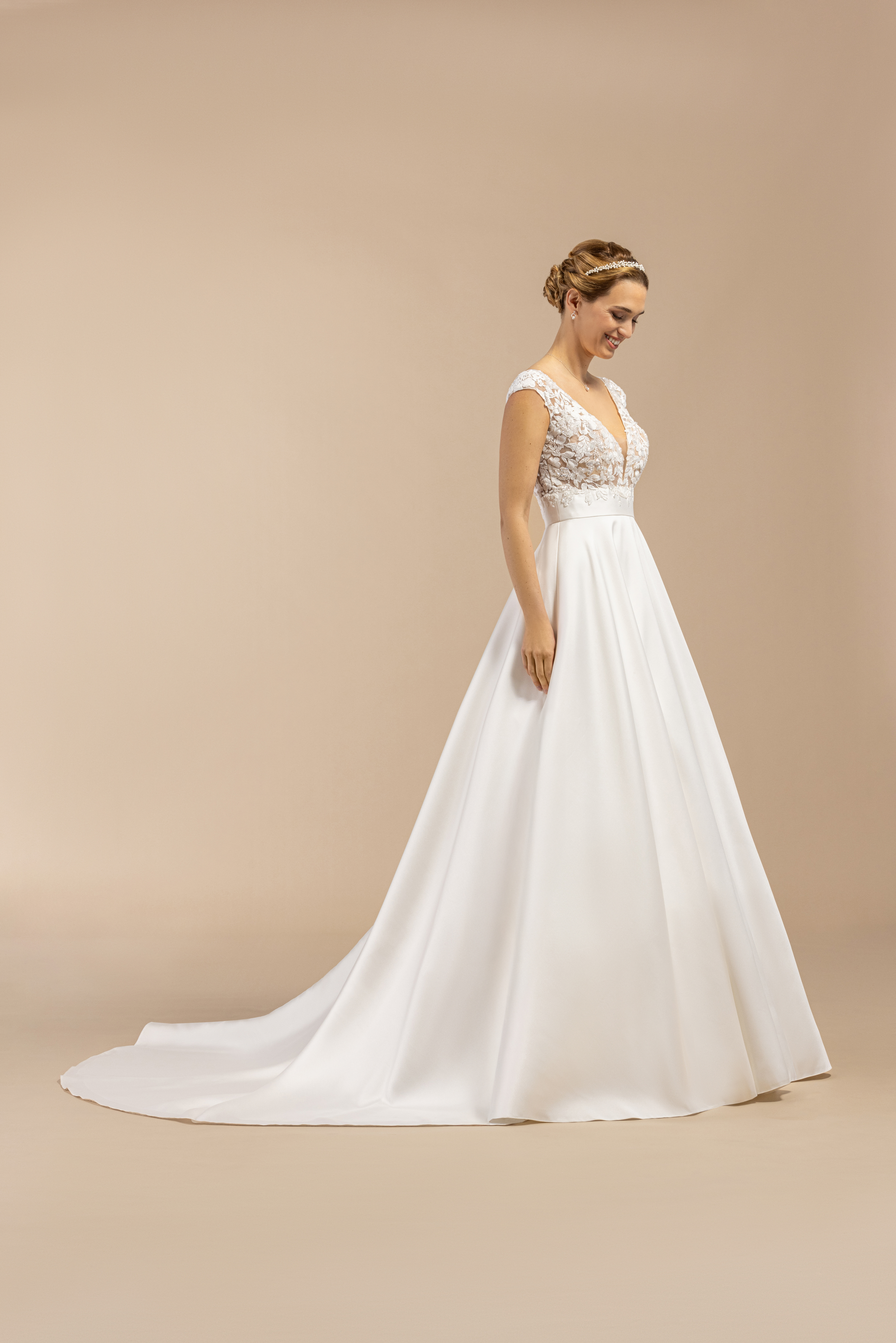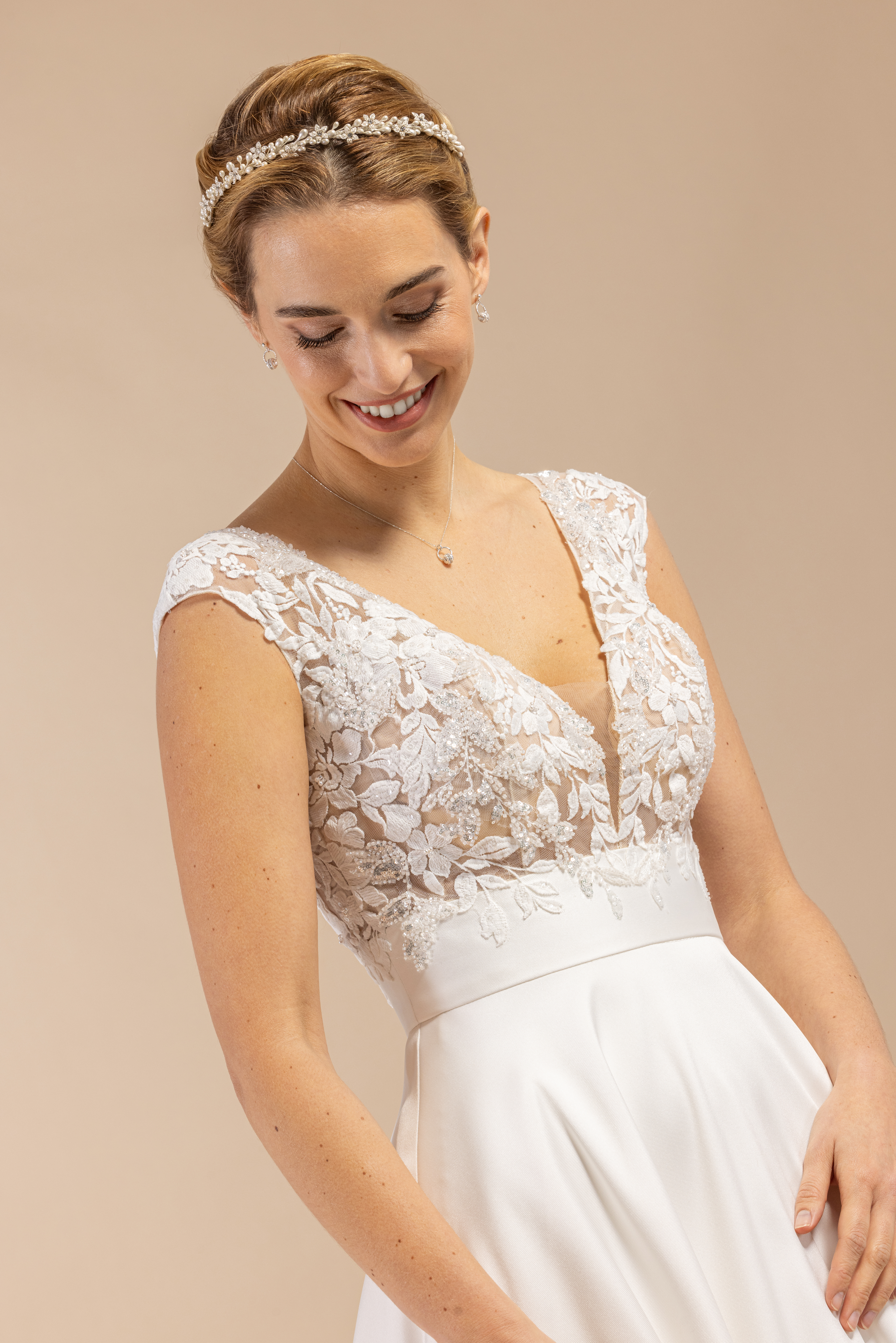 Ein Brautkleid für Bräute, die klassische Eleganz und moderne Details lieben – und dabei nicht auf einen attraktiven Outlet-Preis verzichten möchten.