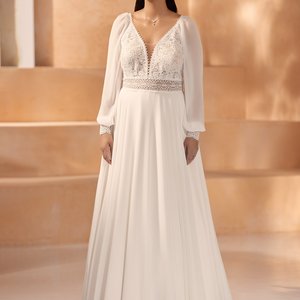 Teresa ist mehr als nur ein Kleid - es ist ein Versprechen, das von Handwerk und Liebe zum Detail geprägt ist. Jeder Stich, jede Spitzenapplikation und jeder Chiffon-Falte wurde mit größter Sorgfalt und Hingabe gefertigt, um sicherzustellen, dass die Braut an ihrem Hochzeitstag einfach makellos aussieht.