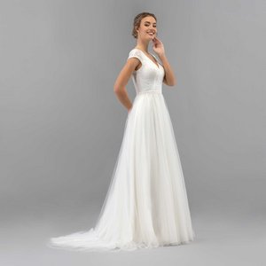 Der Schnitt des Kleides ist schmeichelhaft und betont die natürliche Schönheit der Braut. Die halbtransparente Spitze am Oberteil fügt eine romantische Note hinzu, während der fließende Tüllrock Leichtigkeit und Bewegung verleiht. Die Tüllschleppe sorgt für einen majestätischen Auftritt und vervollständigt das Brautkleid auf elegante Weise.