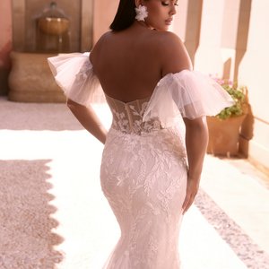 Der V-förmige Ausschnitt und der tief ausgeschnittene Rücken verleihen dem Kleid eine verführerische, aber auch elegante Note. Diese stilvollen Schnitte bringen Dekolleté und Rücken gekonnt zur Geltung und schaffen eine feminine Silhouette, die besonders bei kurvigen Bräuten wunderschön zur Wirkung kommt. Die natürliche Taillenbetonung setzt die Figur optimal in Szene, während die Meerjungfrau-Silhouette die Kurven sanft umschließt und die Linien des Körpers elegant hervorhebt.
