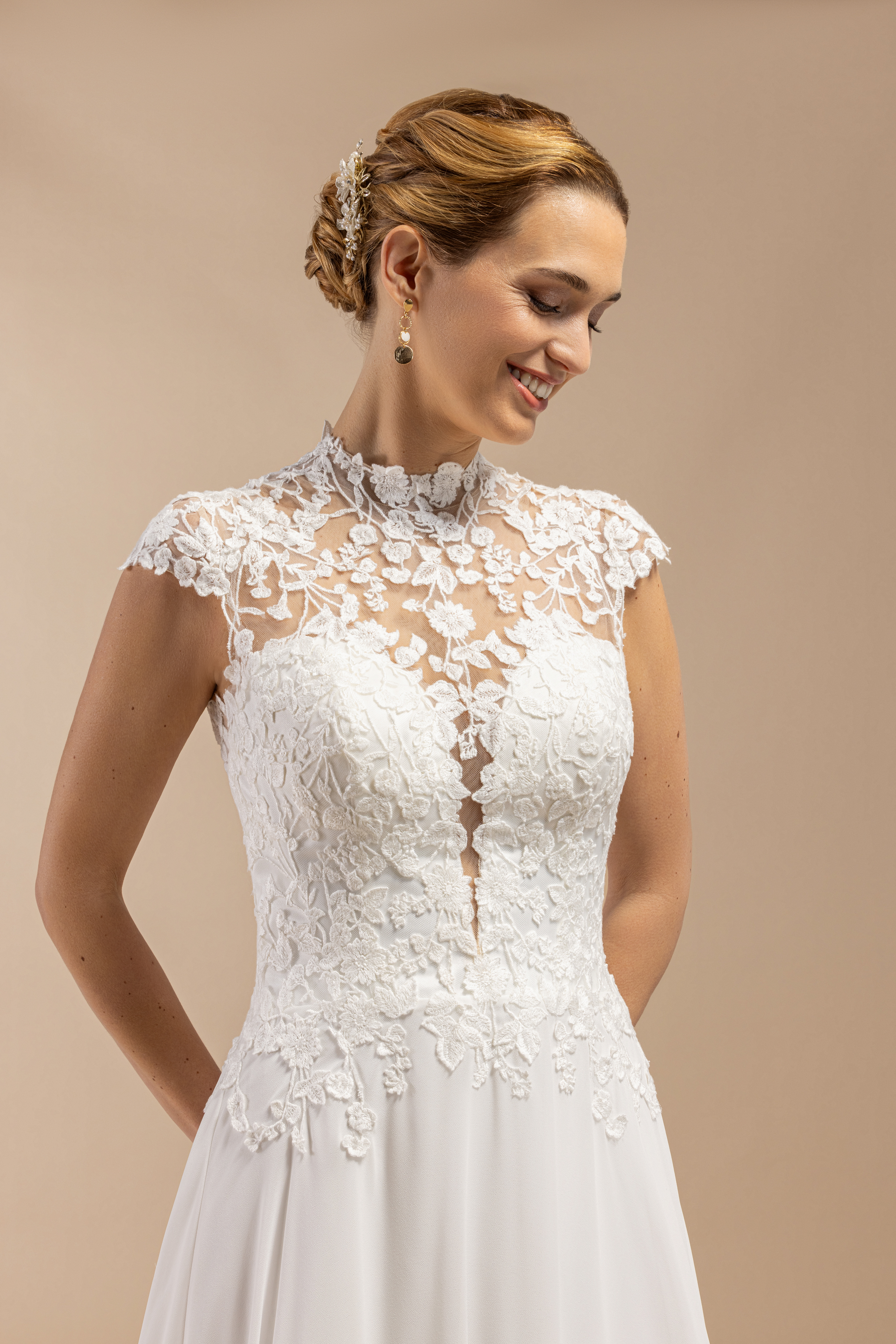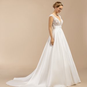 Die Corsage ist ein echtes Highlight dieses Brautkleides. Zarte florale Spitze liegt wie ein feiner Schleier auf der Haut und sorgt für einen eleganten Illusions-Look mit leicht höherem Ausschnitt. Die angeschnittenen Ärmelchen verleihen dem Design eine romantische Note und geben dem Kleid eine besondere Leichtigkeit. Ein feiner, vertikaler Schlitz in der vorderen Mitte setzt einen modernen, femininen Akzent – dezent und stilvoll zugleich.