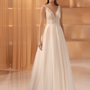 Das Brautkleid Ursula ist einfach zauberhaft! Mit seinem romantischen A-Linien-Schnitt und der Kombination aus zarter Spitze und fließendem Chiffon ist es ein wahrer Traum für jede Braut.