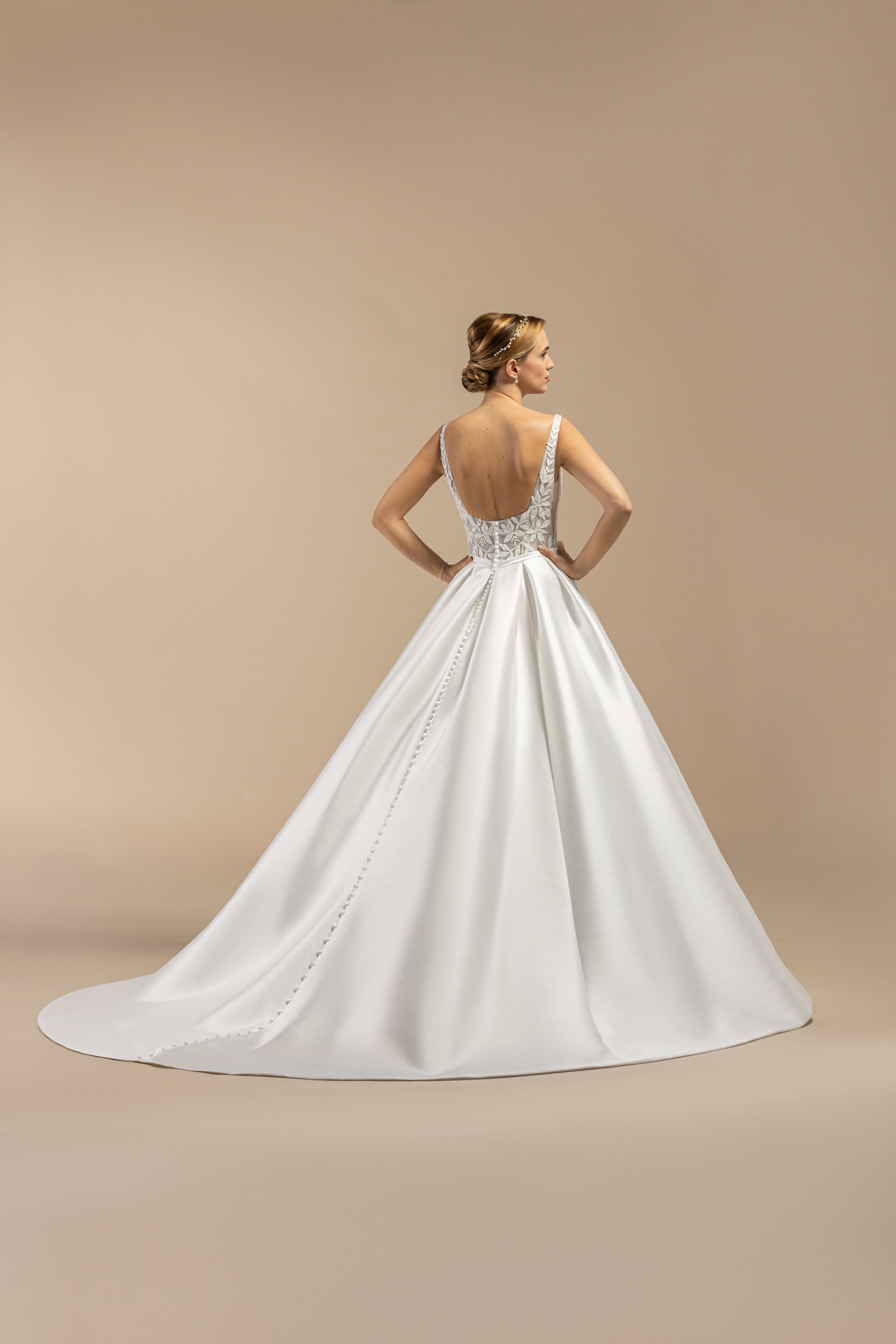 Die klar definierte Taille geht fließend in den strukturierten Mikado-Rock über. Der hochwertige Stoff sorgt für einen schönen Stand, eine ruhige Bewegung und eine zeitlose Ausstrahlung. In der Rückansicht überzeugt das Kleid mit einem tiefen Rückenausschnitt und einer feinen Knopfleiste, die das Design harmonisch abrunden. Eine dezente Schleppe vollendet den Look.