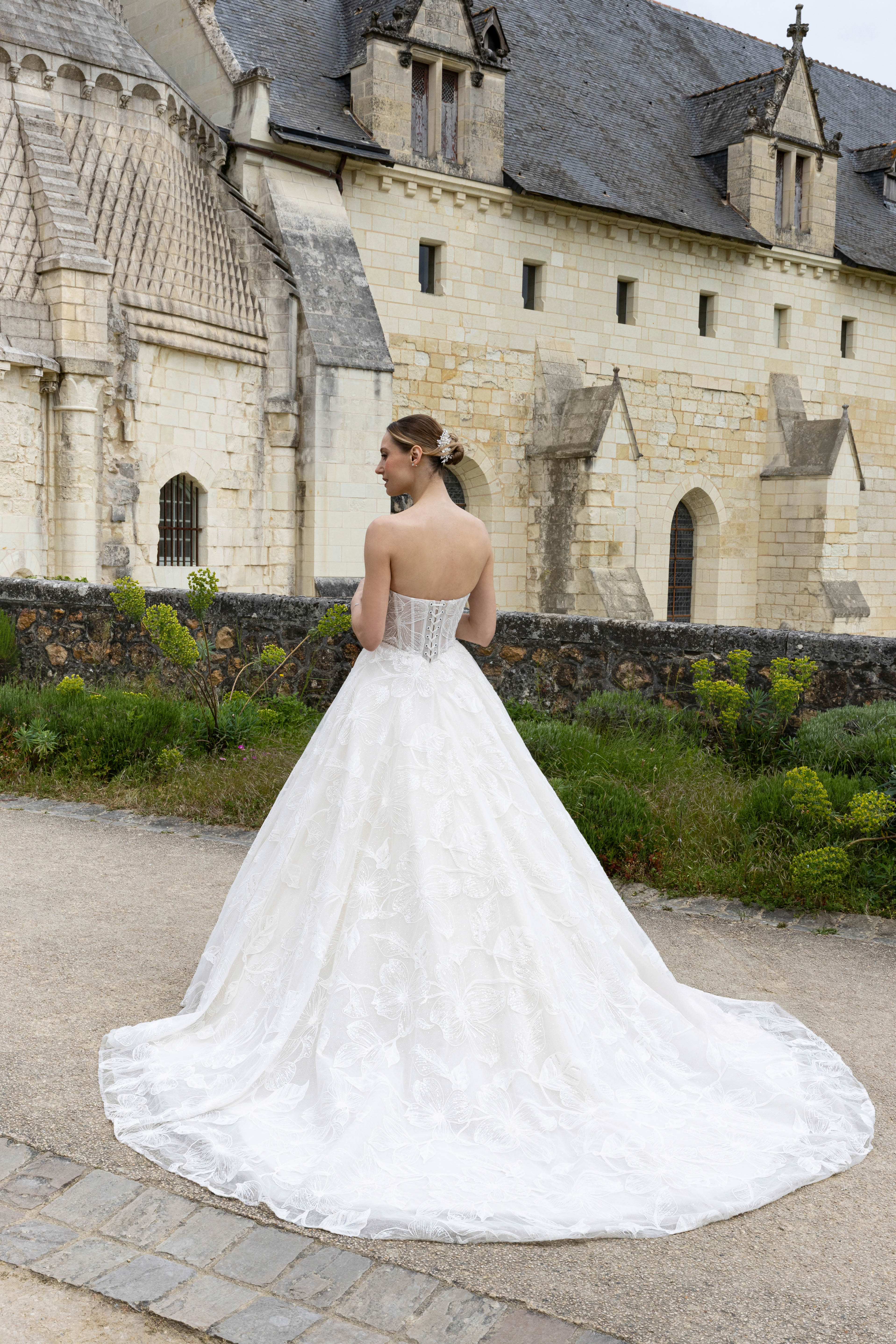 Der voluminöse Rock entfaltet seine Wirkung durch mehrere Lagen feinen Tülls. Unter der Spitzenlage liegt zarter Glitzertüll, der dem gesamten Kleid eine sanfte Tiefe und einen märchenhaften Schimmer verleiht – sichtbar bei Bewegung und im richtigen Licht, aber stets elegant und zurückhaltend. Die floralen Spitzenapplikationen ziehen sich großzügig über den Rock und unterstreichen den romantischen Charakter des Designs. Eine weiche Schleppe rundet den Look stilvoll ab.