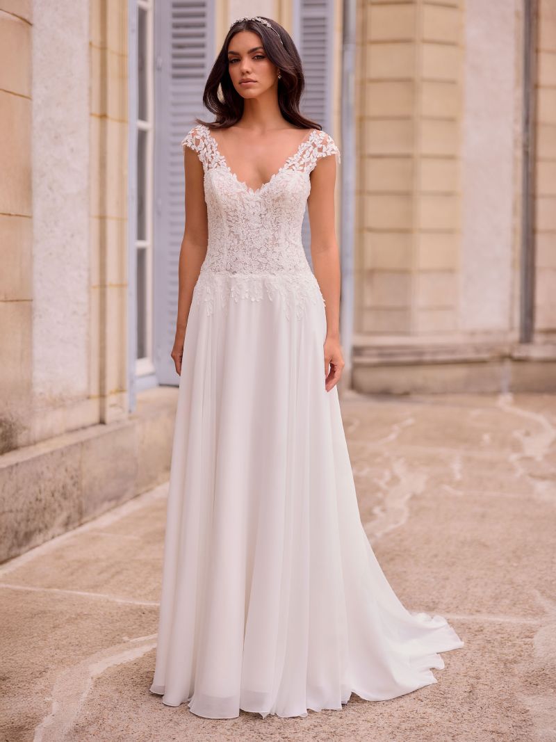 Dieses A-Linien-Brautkleid überzeugt durch ein fein gearbeitetes Spitzenoberteil mit floralen Applikationen, das dem Look eine sanfte, feminine Note verleiht. Der V-Ausschnitt wirkt elegant und ausgewogen, während der offene Rücken das Design modern und leicht erscheinen lässt. Der weich fallende Rock öffnet die A-Linie fließend und sorgt für eine natürliche Bewegung sowie ein angenehmes Tragegefühl.