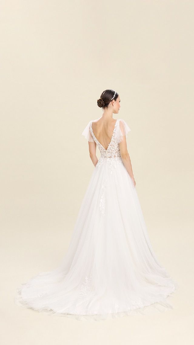 Ein besonderes Detail sind die abnehmbaren Ärmel: Sie geben dir die Freiheit, deinen Stil im Handumdrehen zu verändern – romantisch zur Trauung, pur für den Abend.