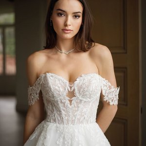 Dieses zauberhafte Brautkleid verbindet klassische Eleganz mit moderner Raffinesse und schafft einen Look, der zeitlos und stilvoll zugleich ist. Das Oberteil besticht durch feine Spitzenapplikationen, die dem Design eine romantische, edle Note verleihen. Die Spitze verläuft über die Träger bis zum Rücken und schafft einen nahtlosen Übergang, der das Kleid harmonisch abrundet. Der tiefe Ausschnitt bringt eine sinnliche Note ins Spiel und hebt die Silhouette der Braut auf besonders elegante Weise hervor.